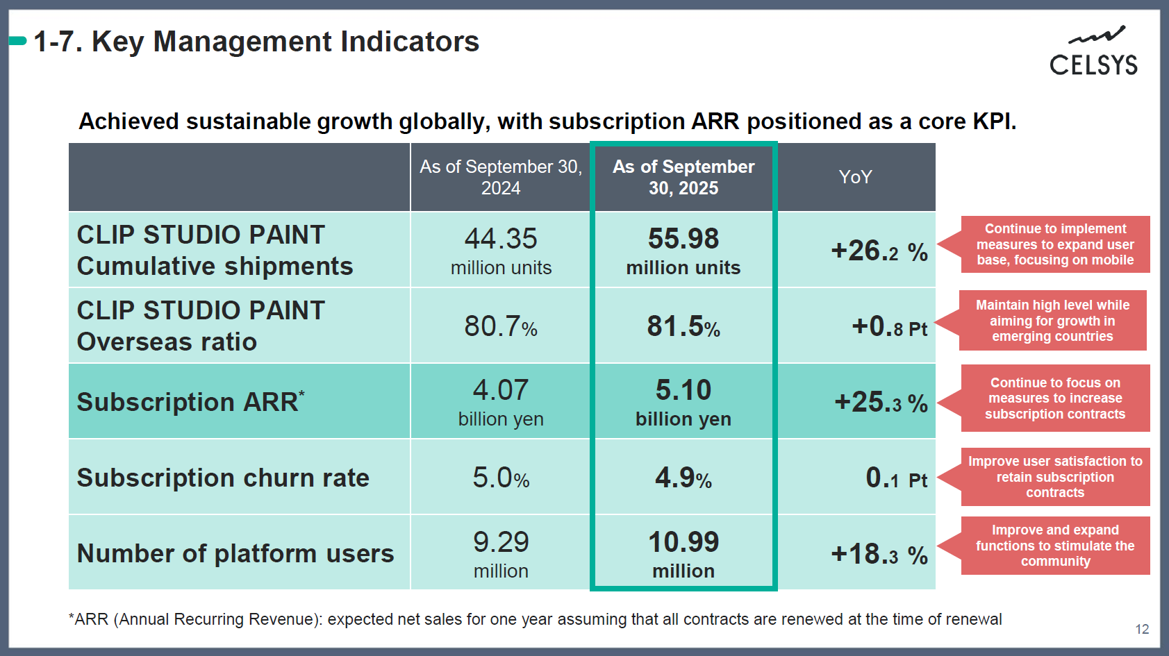 Celsys has made subscription ARR a core KPI to achieve sustainable growth globally. We will continue to implement updates to improve the creative experience for all creators from professionals to entry-level users, and to expand the adoption of the subscription model.