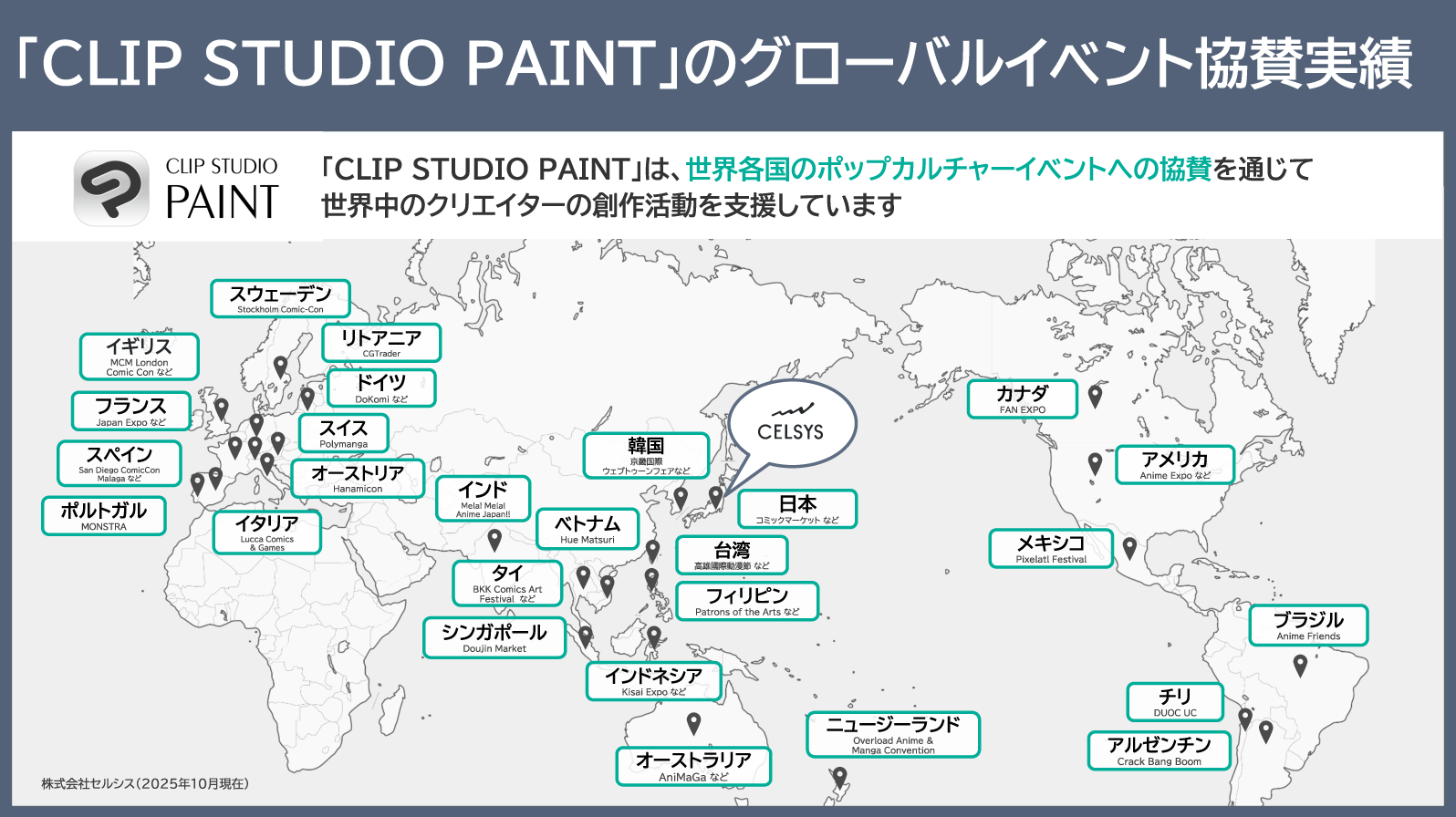 セルシスは、世界中の教育機関での取組みや、主要なポップカルチャーイベントにも積極的に協賛し、クリエイターとの接点を強化しています。また、現地の文化やニーズに寄り添ったマーケティング施策を実施し、日本のマンガ・アニメーション文化に興味関心の高いグローバルなクリエイター層における、「CLIP STUDIO PAINT」の認知度向上を目指しています。