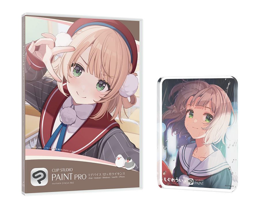 会場ではコラボを記念して、しぐれうい先生のアクリルブロックがセットになった「CLIP STUDIO PAINT PRO 1デバイスプラン12ヶ月版 コラボパッケージ」を販売します。