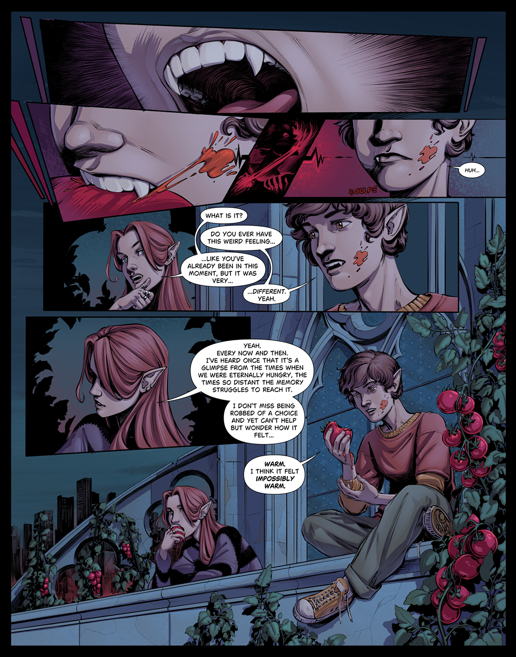 講評:ひと目で惹き込まれる素晴らしい作風です。特に色使いが印象的で、主要人物には柔らかく温かみのあるトーンを、特定の要素には、力強く冷たくより暗い色合いが用いられています。このコントラストが、作品のストーリーの展開と感情の重みを際立たせています。(Mirka Andolfo 氏)