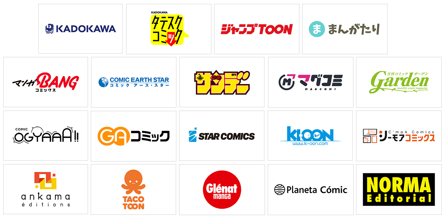 KADOKAWA、TATESC COMICS、ジャンプTOON、まんがたり、マンガBANG、コミック アース・スター、少年サンデー、マグコミ、月刊コミックガーデン、コミックオギャー!!、GAコミック、Star Comics、Ki-oon、シーモアコミックス編集部、Ankama Éditions、TACOTOON、Glénat Manga、Planeta Cómic、Norma Editorial